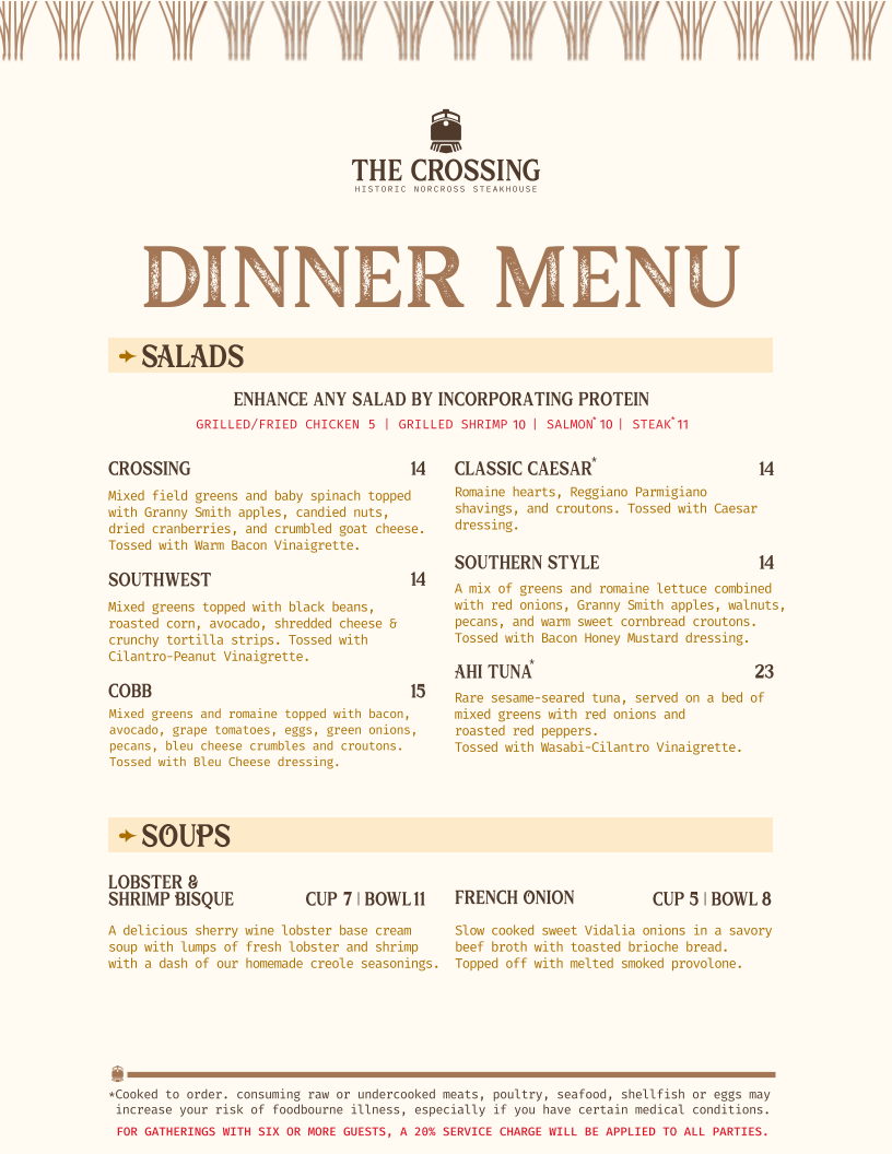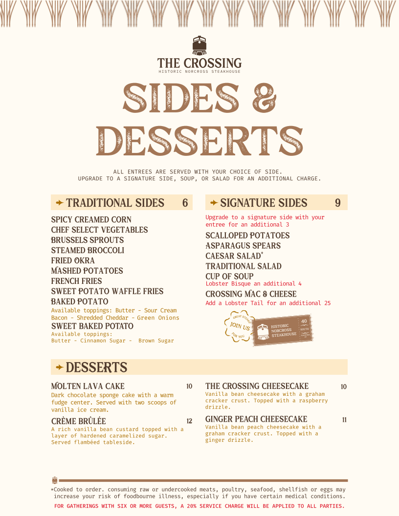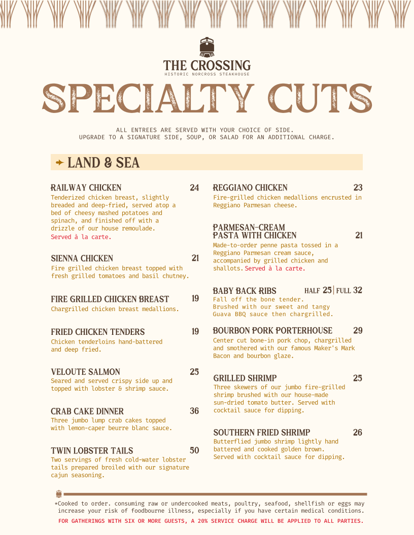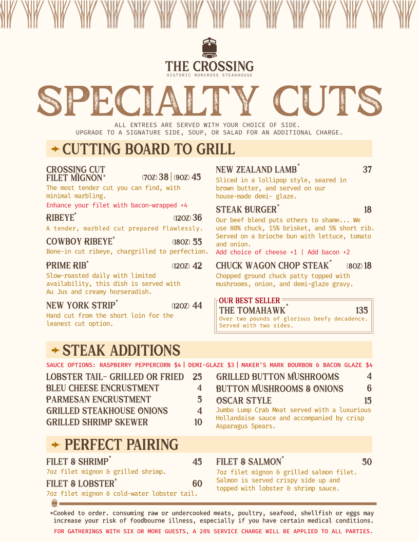 The Crossing Steakhouse in Norcross, GA, offers a refined yet rustic dining experience centered around expertly crafted steaks. The menu showcases prime cuts like the Crossing Cut Filet, celebrated for its tender, lean profile with minimal marbling, and the richly flavored Ribeye, known for its hearty fat marbling. For those seeking bold flavors, the Cowboy Cut Ribeye stands out with the bone enhancing its taste, while the Center Cut New York Strip and Top Sirloin provide perfectly balanced options. Beyond steaks, the Chuck Wagon Chop Steak offers a classic, hearty choice.