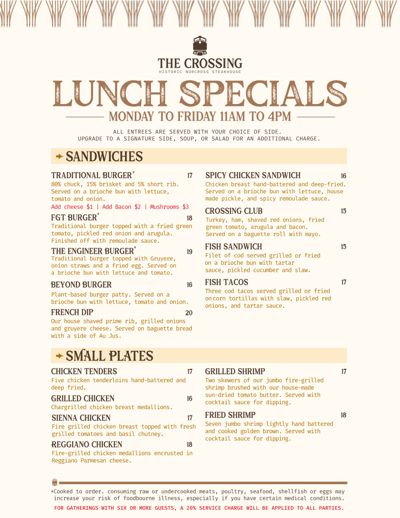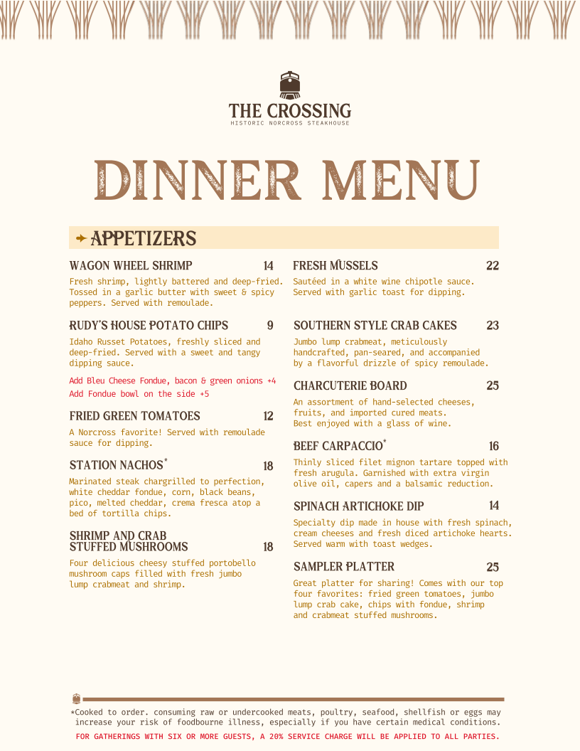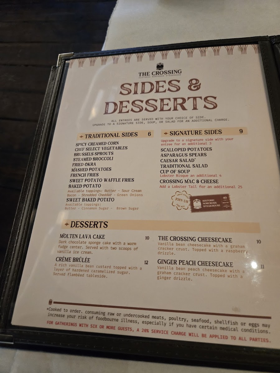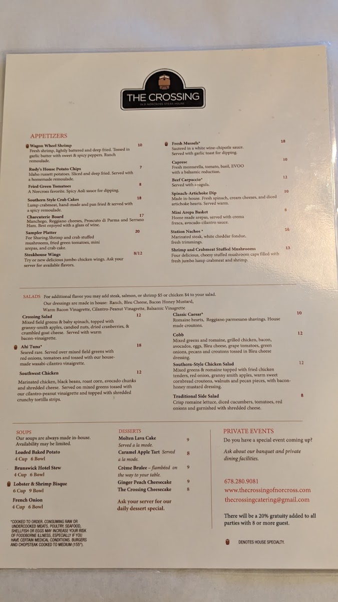 Complimentary dishes like fried green tomatoes, crab cakes, and freshly prepared salads amplify the Southern charm. Notably, desserts such as peach ginger cheesecake and creme brulee receive high praise, rounding out a memorable meal. Guests consistently commend the welcoming service and the menu’s adaptability, making it a prime destination for both intimate dinners and larger gatherings. The Crossing Steakhouse masterfully fuses quality, flavor, and hospitality into every plate.